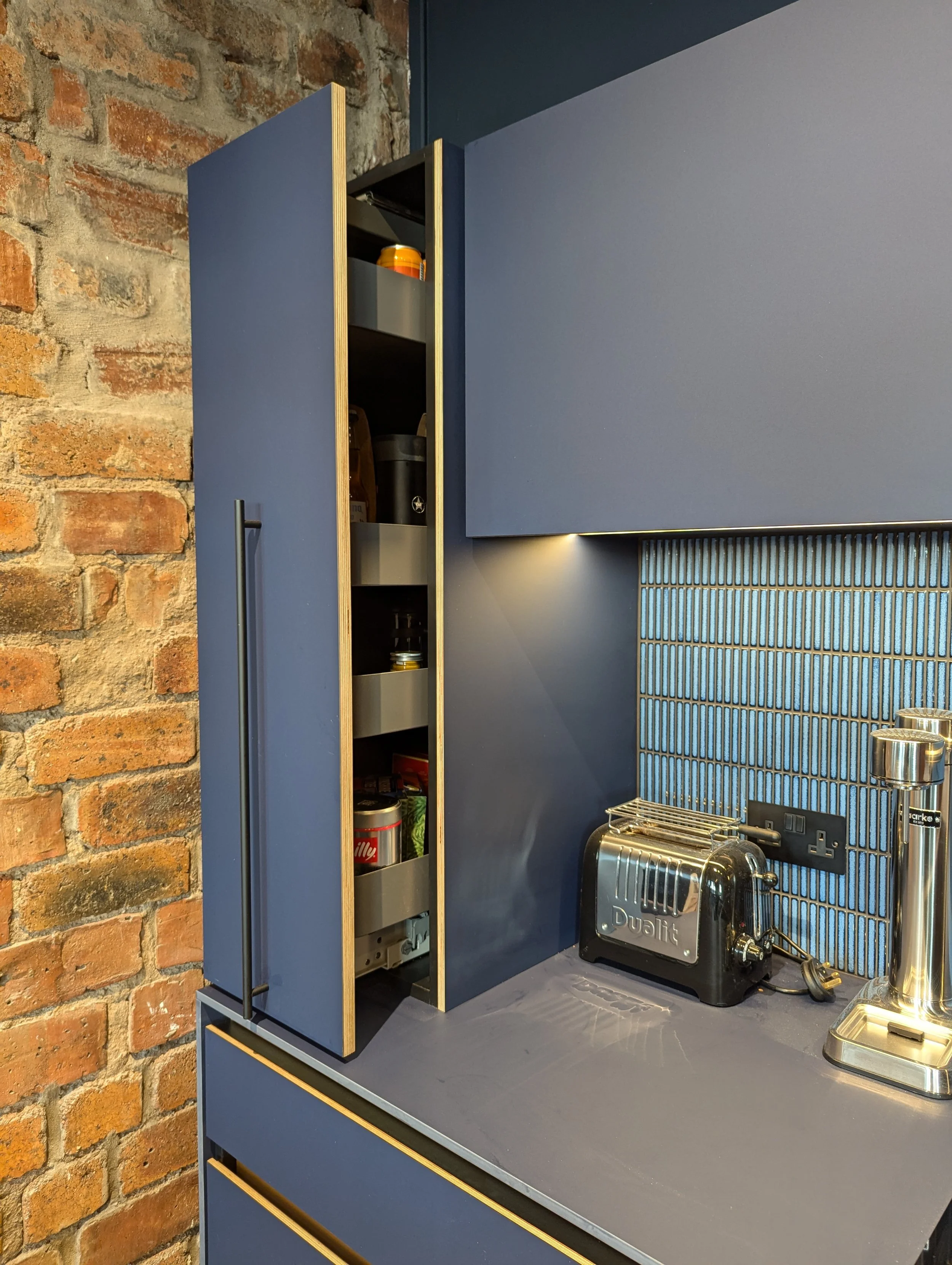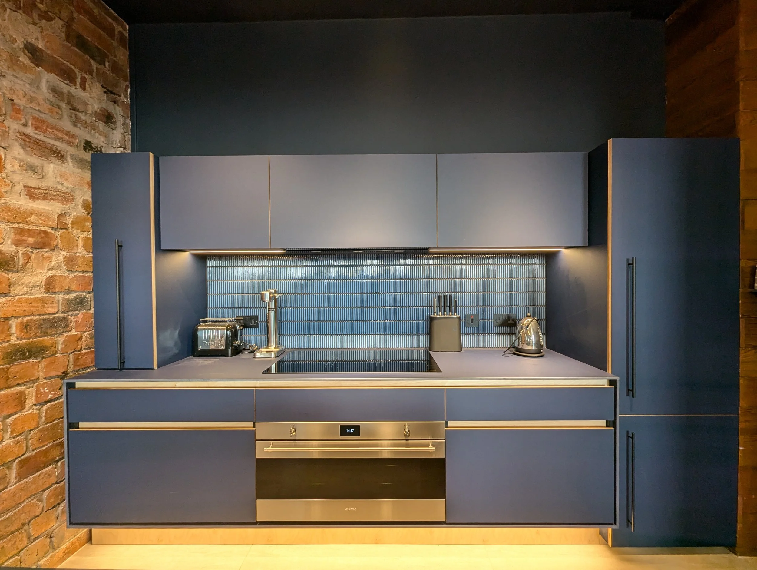 A Fantastic kitchen in a compact studio flat. Deep blue Fenix with some beautiful kitkat tiles to match and a touch of sapele thrown in. Design by Lee Ackland