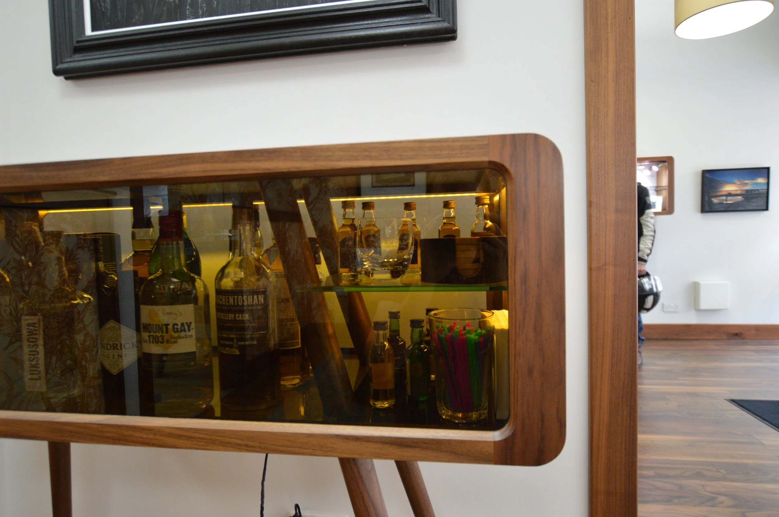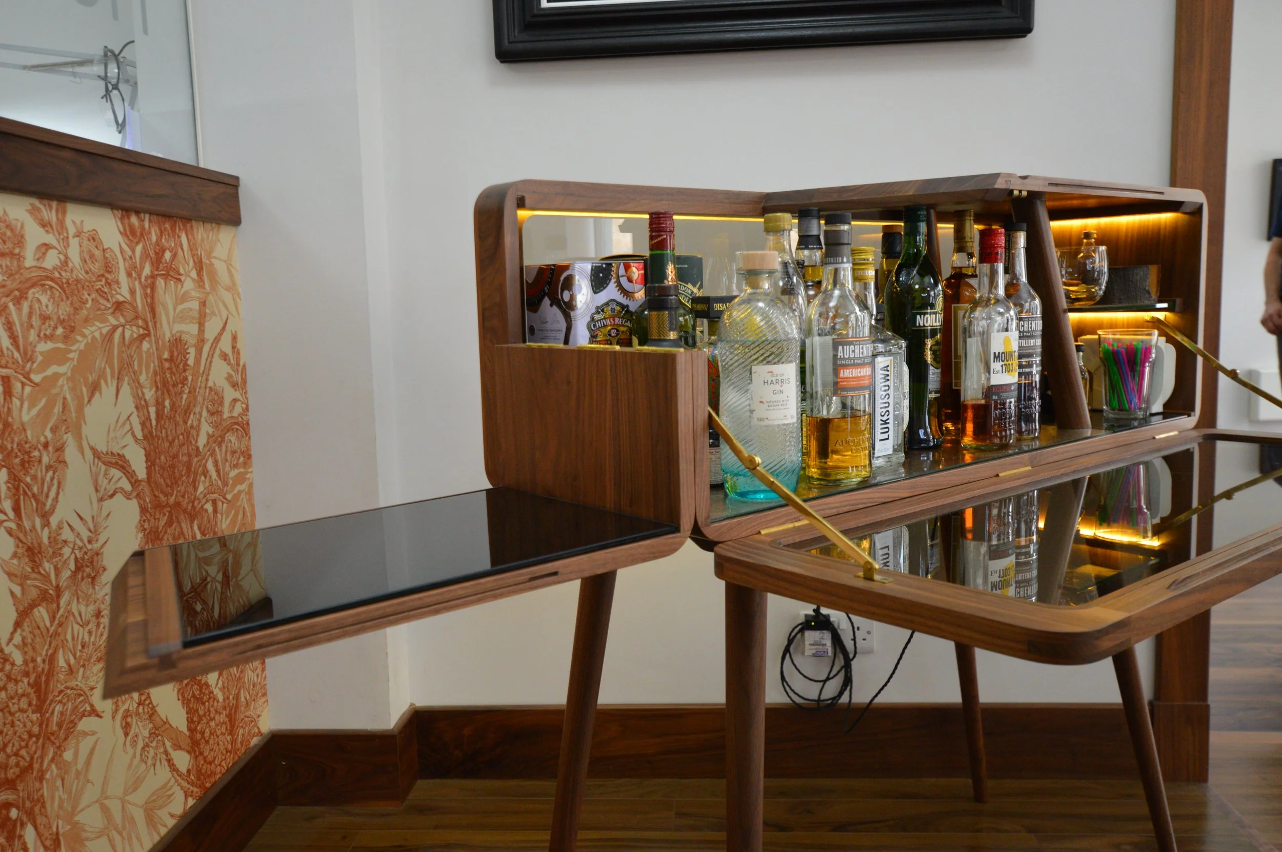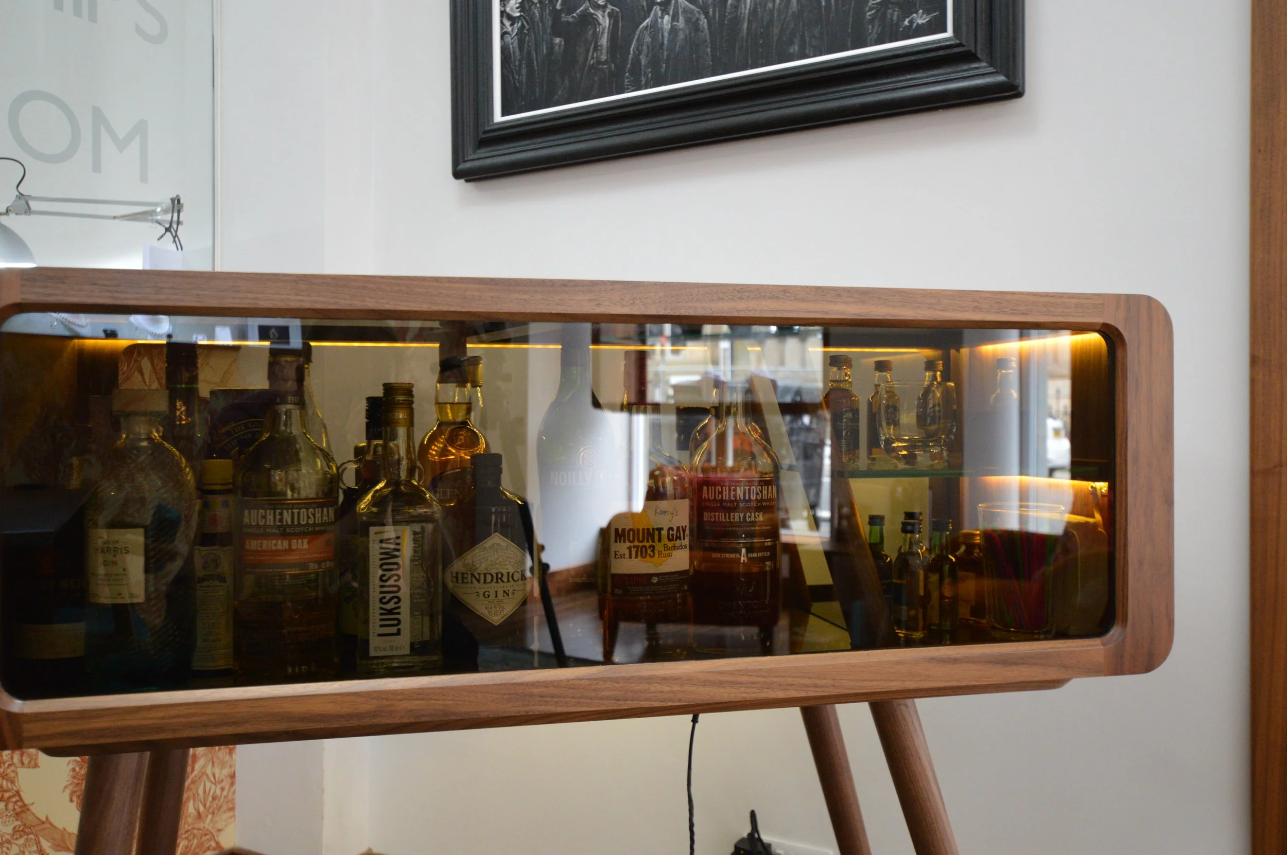 Beautiful work, mostly in black walnut, for display cases, desks, and other items in this luxury bespoke jewelers workshop in Glasgow’s west end. We used the curved finger jointed corner detail throughout for strength and aesthetics. We also designed the Kelvin Chair initially as a commission for them. Later on we had the pleasure of working on an amazing little bar cabinet that was a true test of making skills! Great local customers, and its always a pleasure to see the amazing work they produce there.