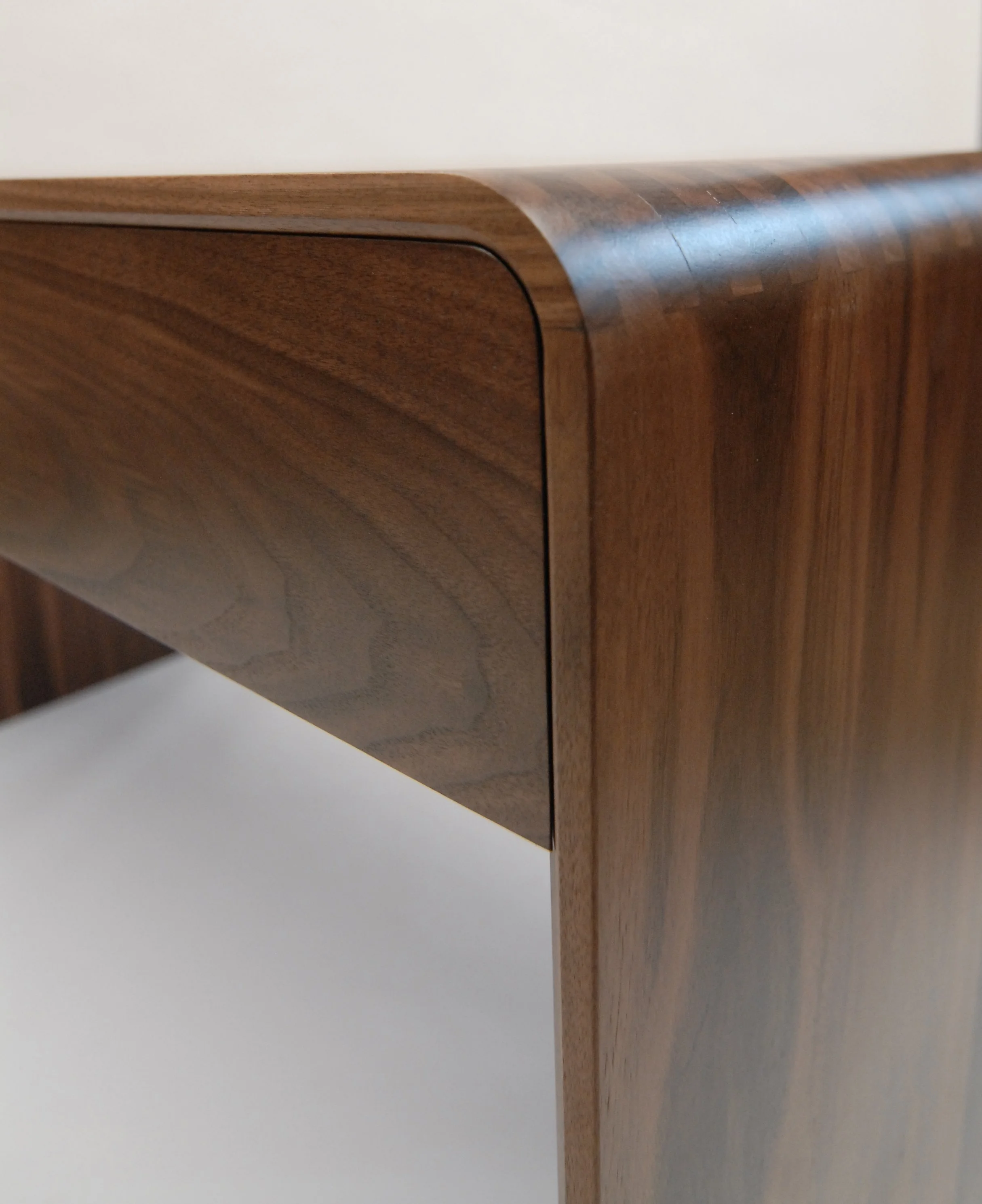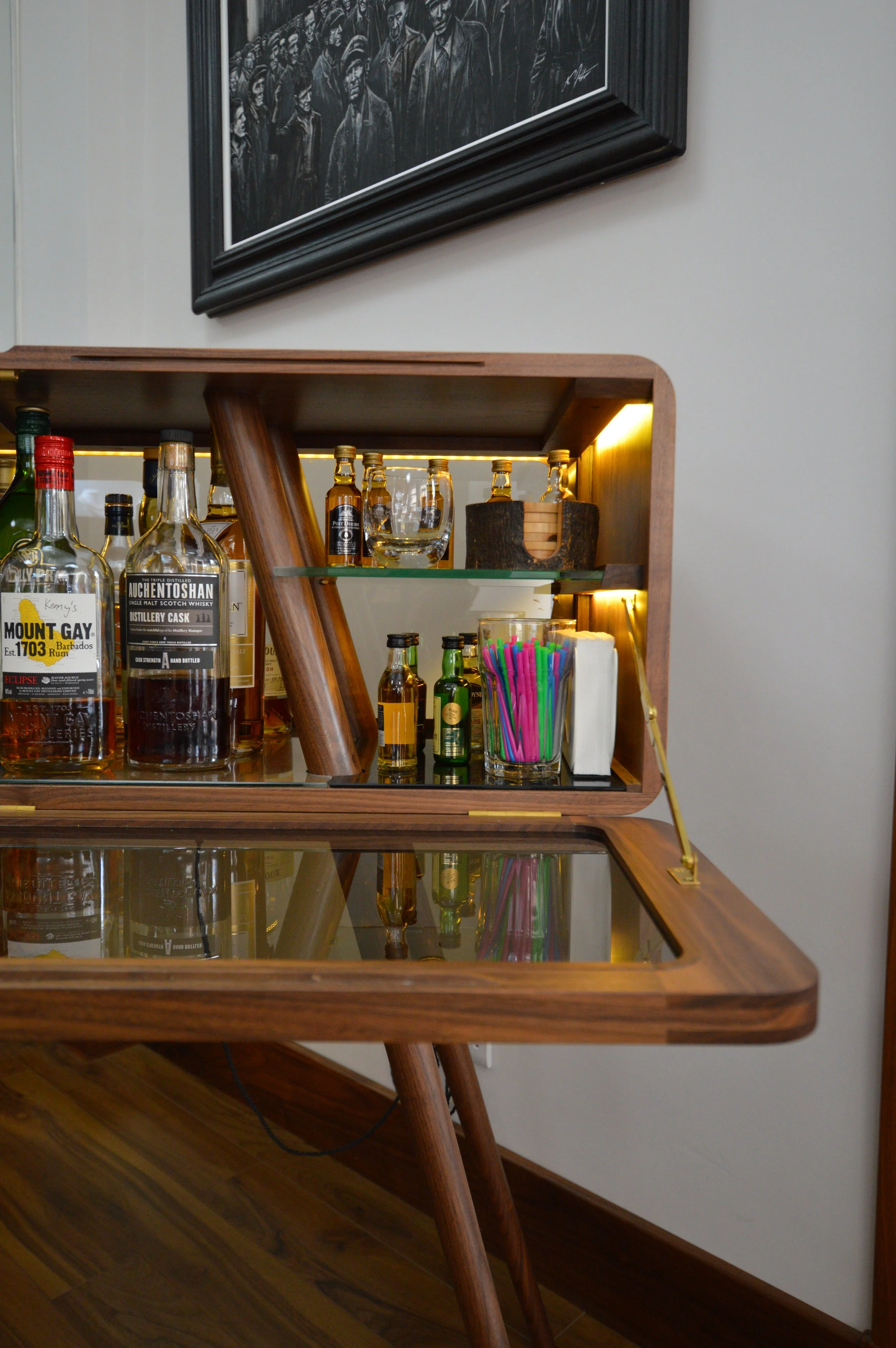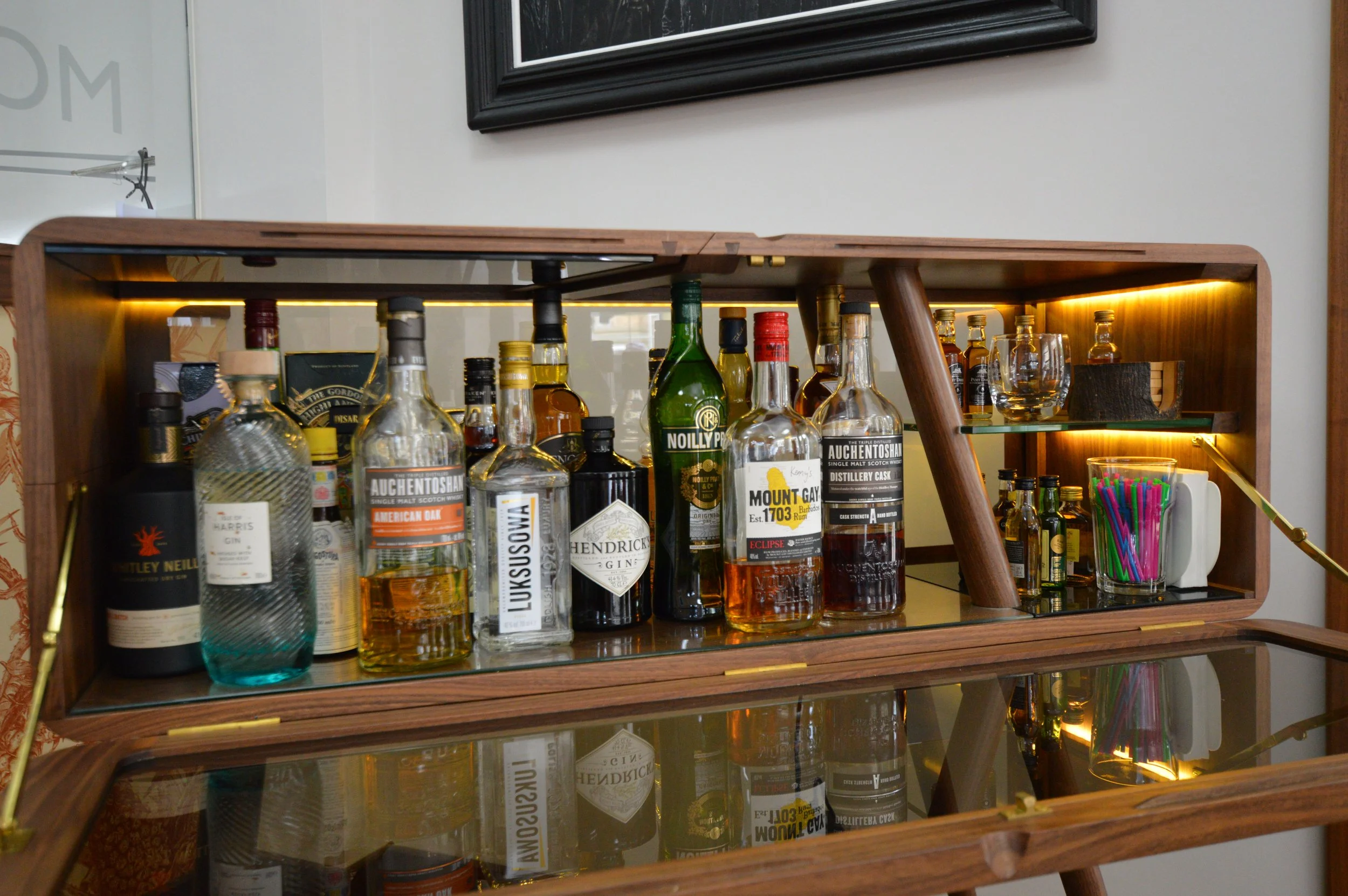 Beautiful work, mostly in black walnut, for display cases, desks, and other items in this luxury bespoke jewelers workshop in Glasgow’s west end. We used the curved finger jointed corner detail throughout for strength and aesthetics. We also designed the Kelvin Chair initially as a commission for them. Later on we had the pleasure of working on an amazing little bar cabinet that was a true test of making skills! Great local customers, and its always a pleasure to see the amazing work they produce there.