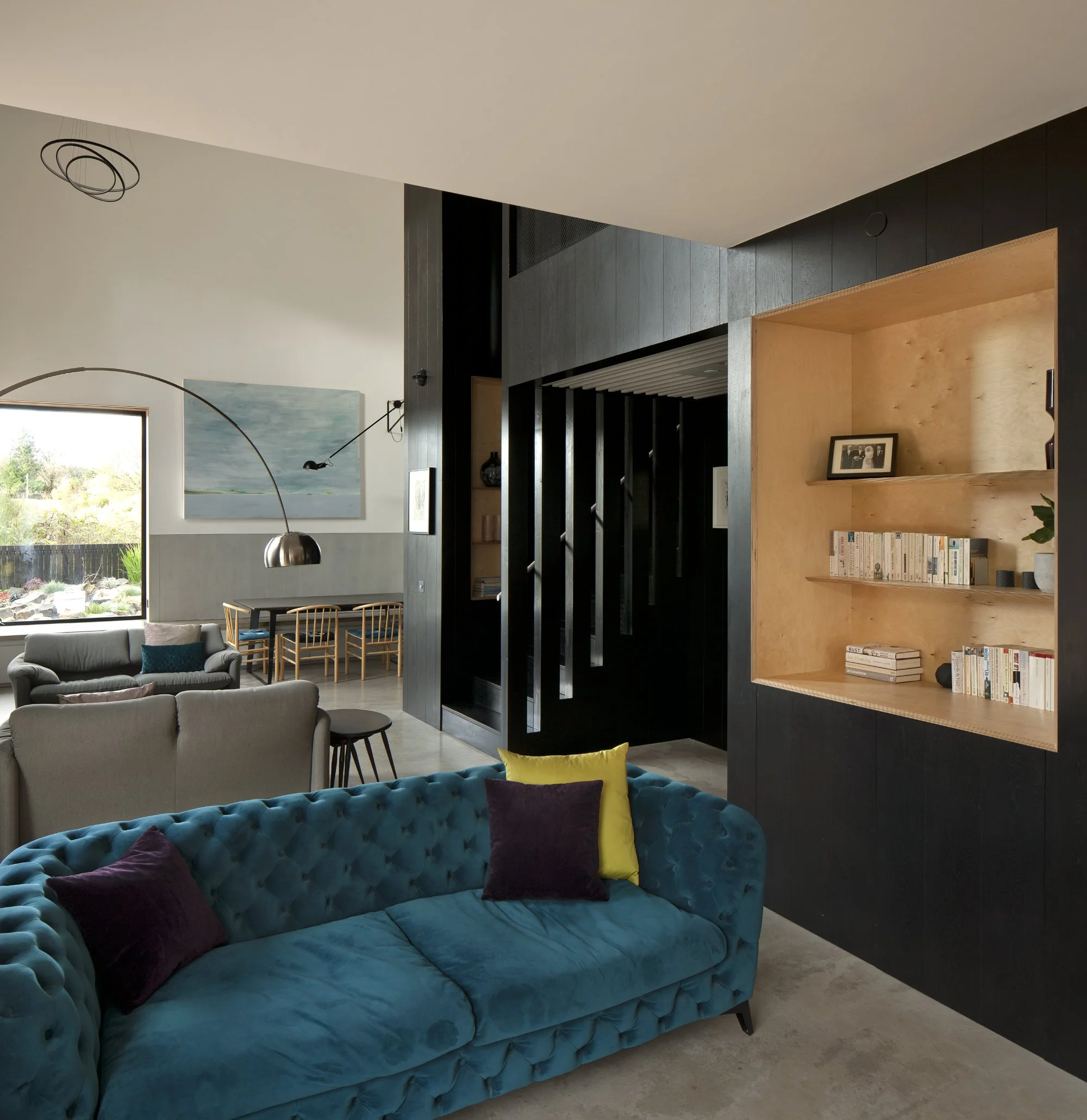 A deep black stair in the core of Ostro Passivehaus. One of several items we created for this impressive build. This stair cleverly conceals drawers in the bottom treads for extra storage, with a special concealed handle design. The client applied their own special black stain mix to the solid oak treads.